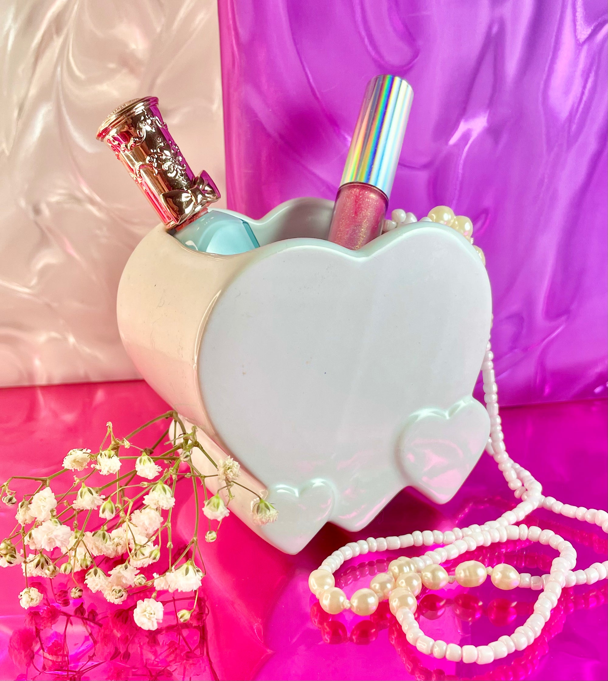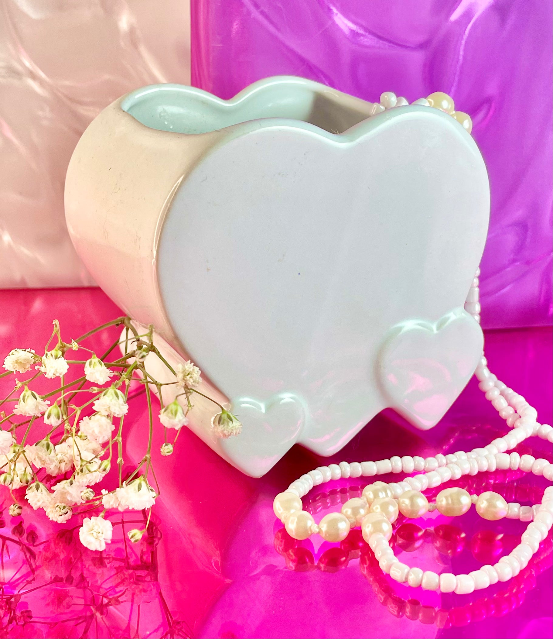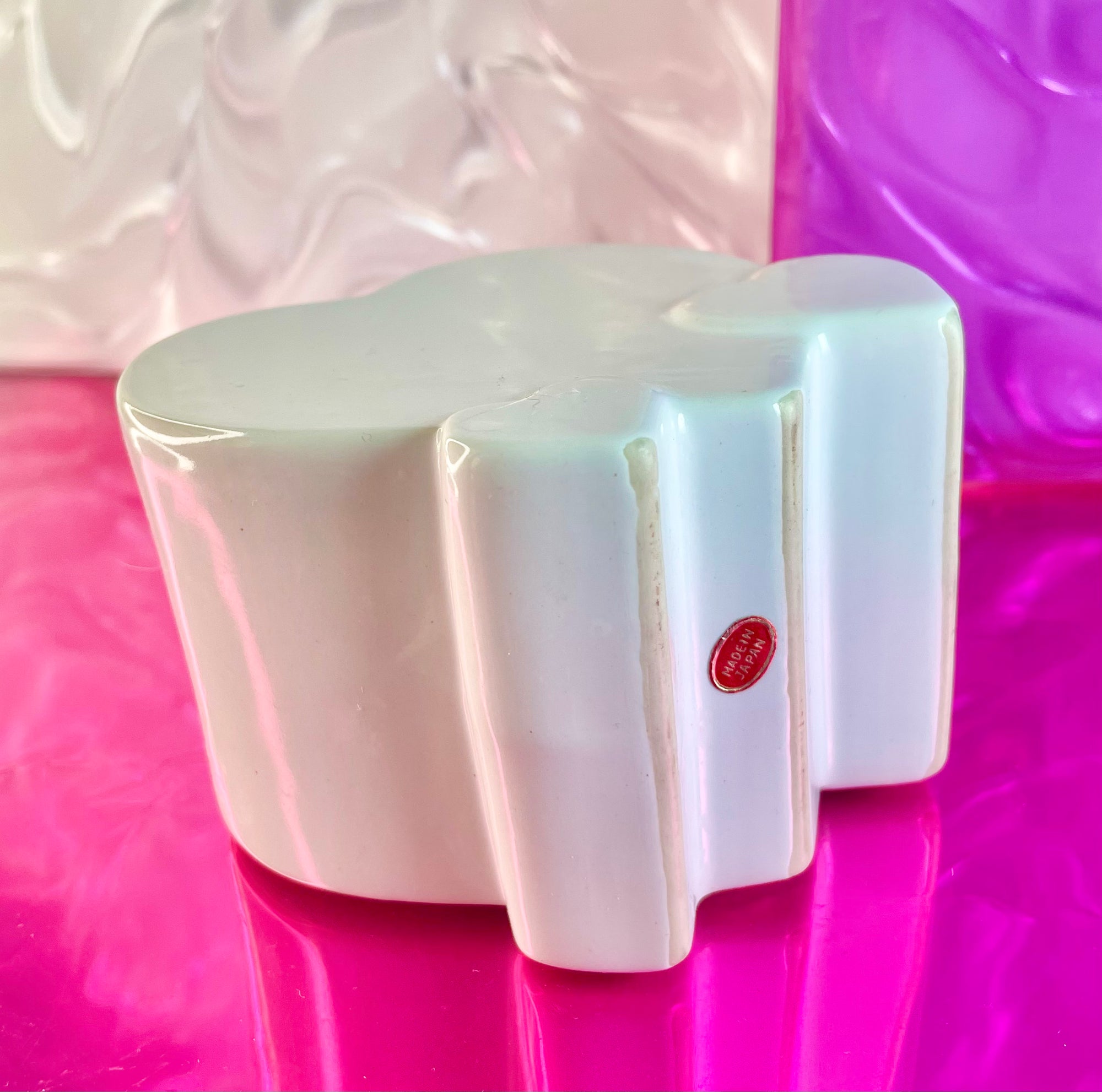 This White Ceramic Heart Stasher Vase features three hearts and is a perfect pen holder or toothbrush holder. The maker's mark on the bottom notes made in Japan.