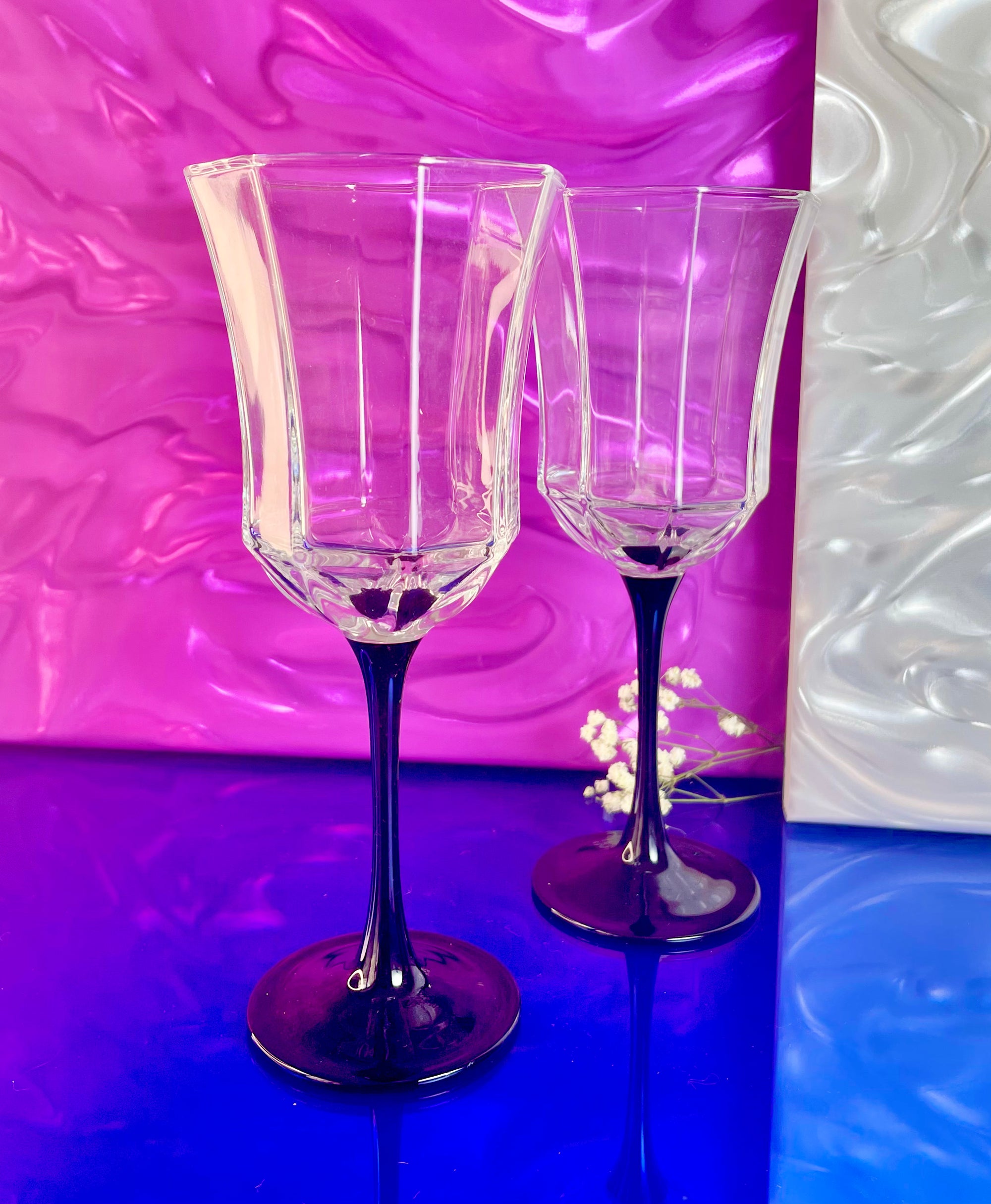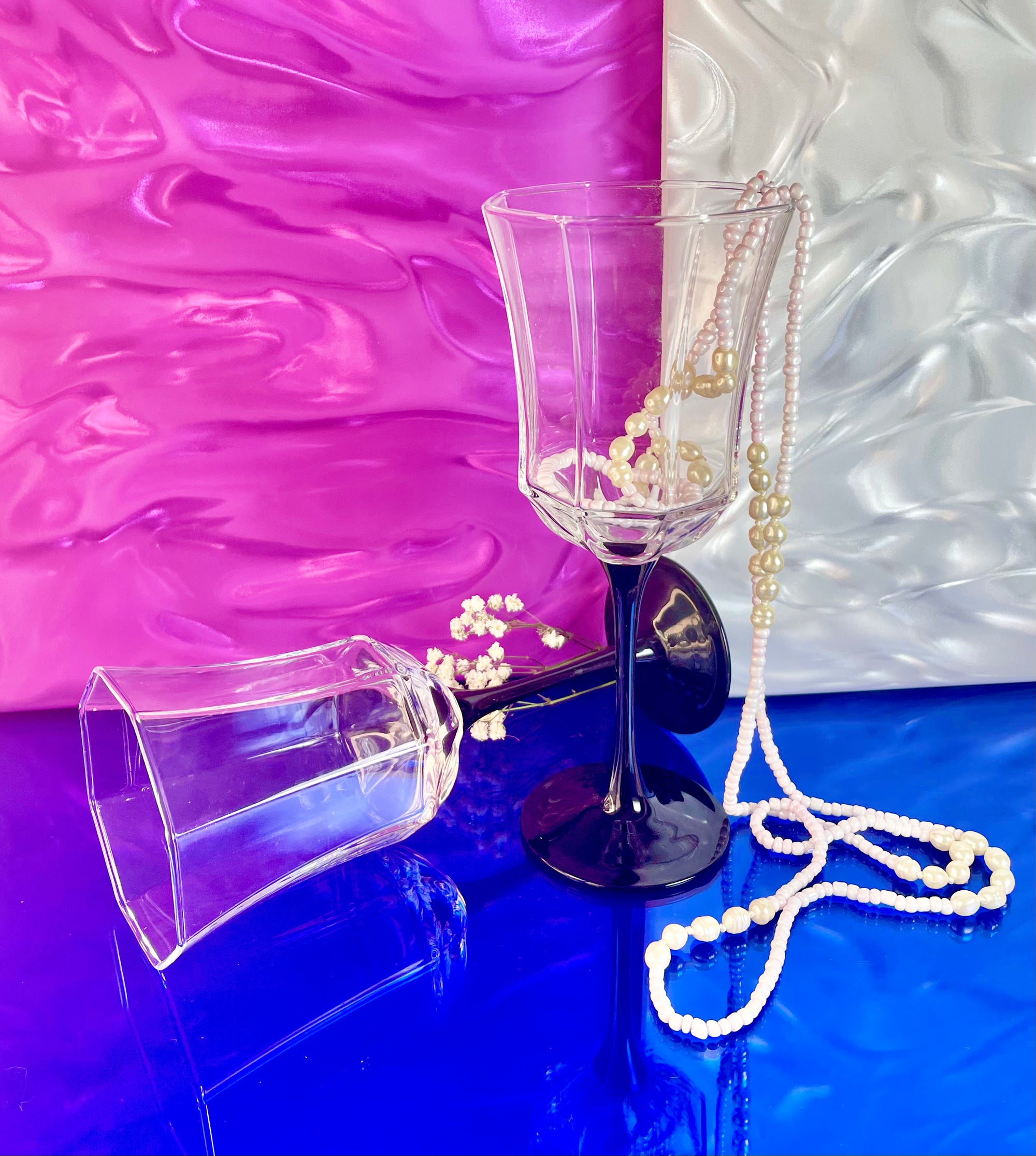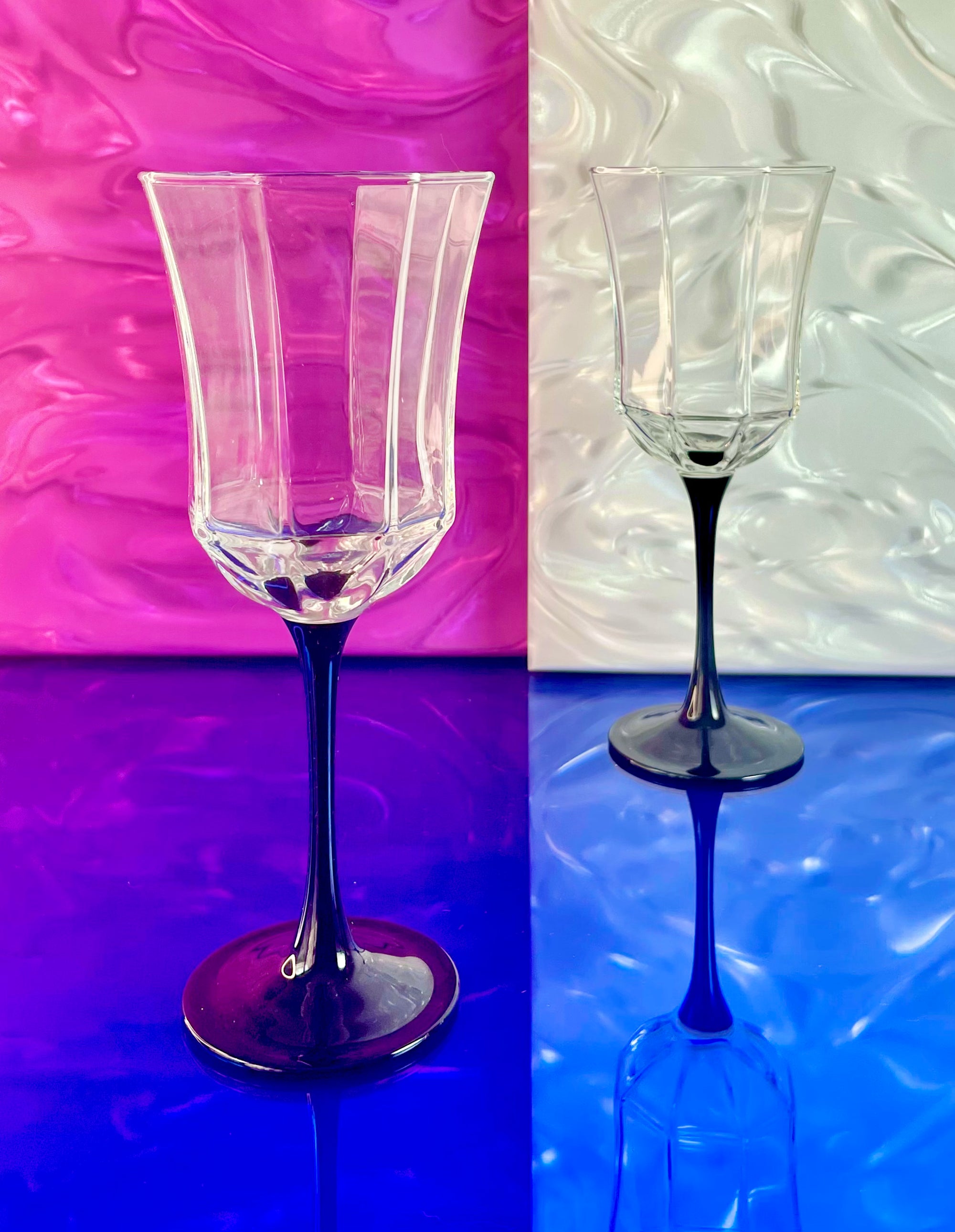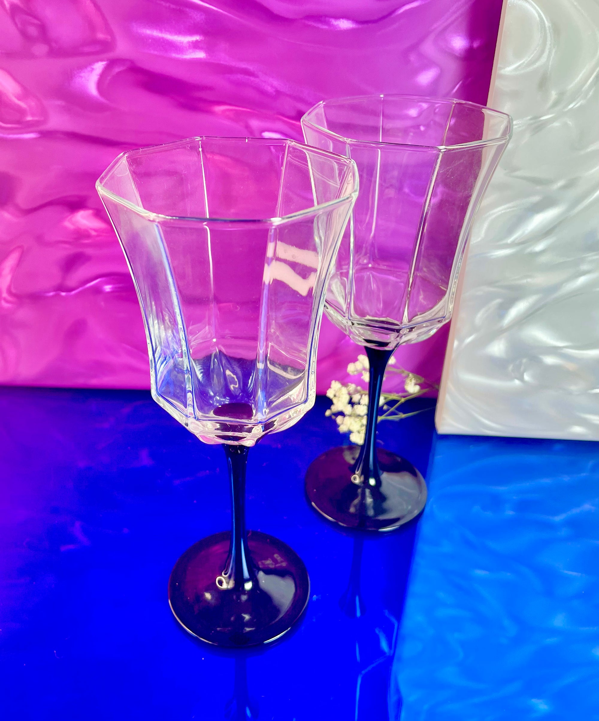 This pair of Clear and Black Facet Wine Glasses feature a facetted clear glass body and an elegant black stem and base.