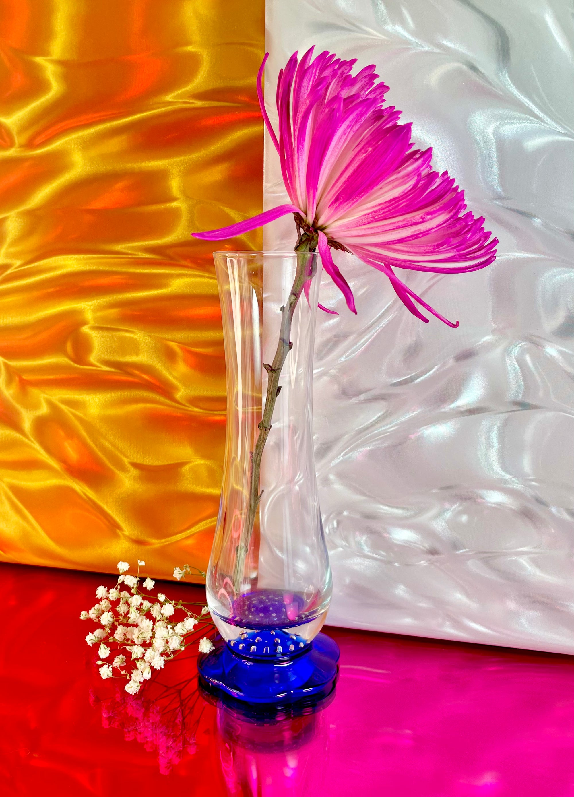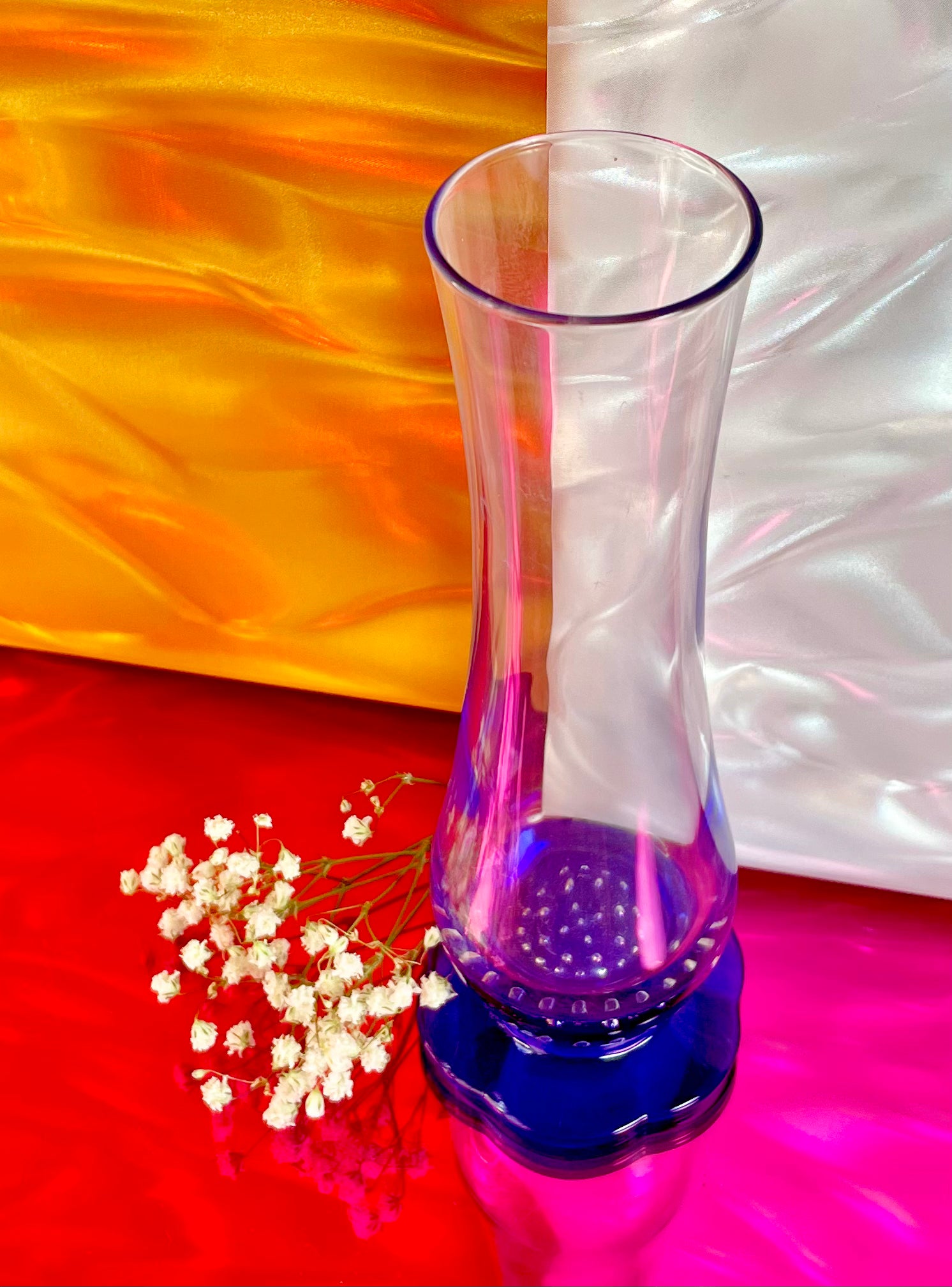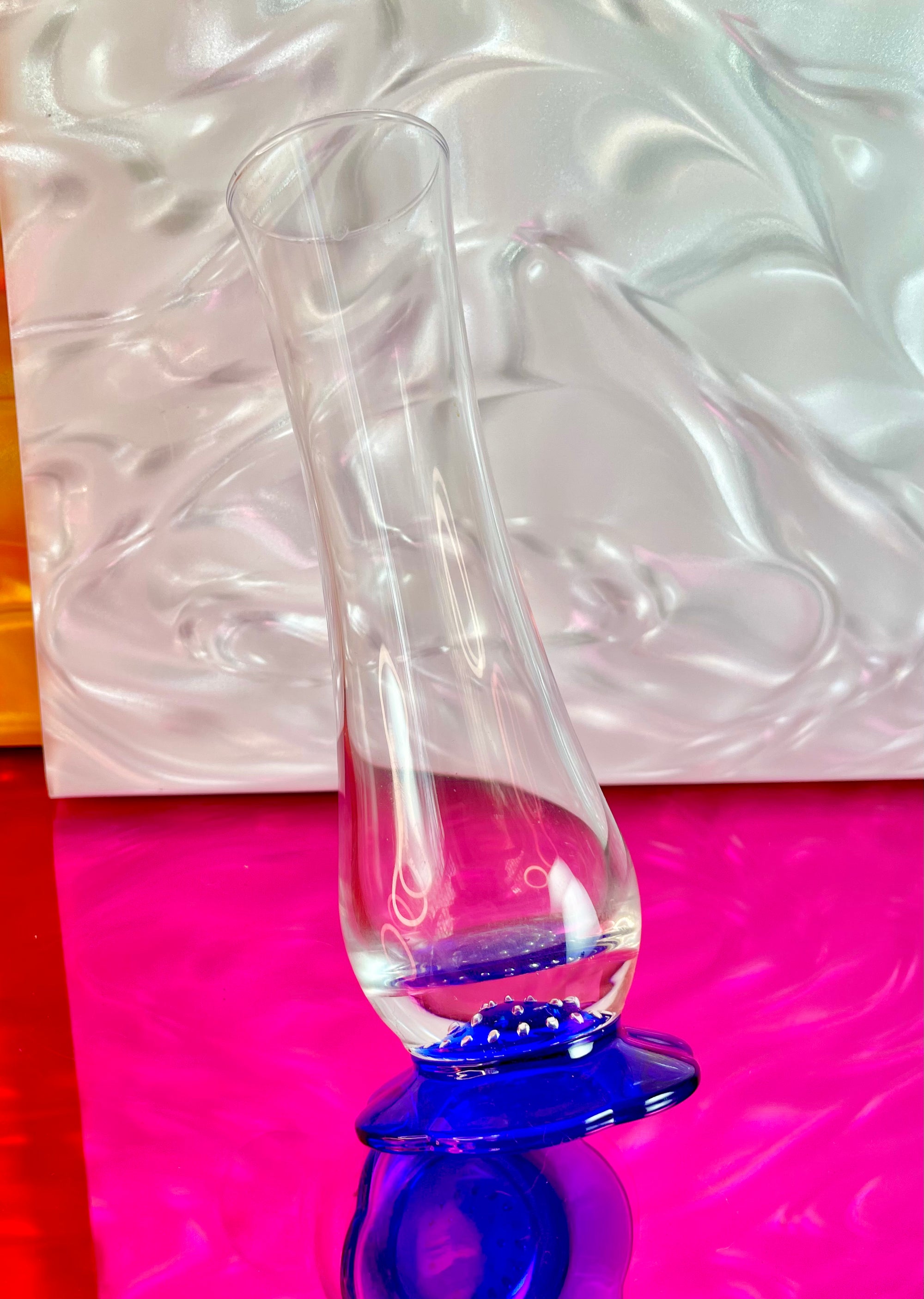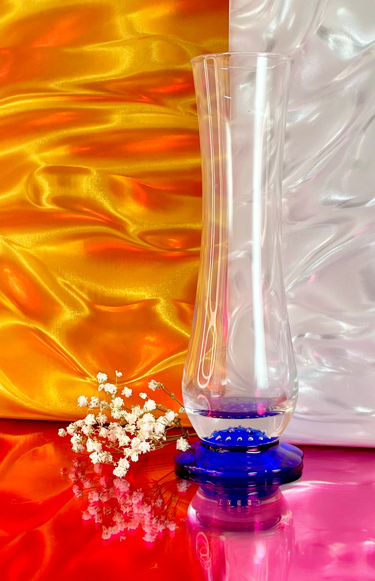 This Clear & Cobalt Blue Floral Trumpet Vase features a flower-shaped blue base, featuring bubble detailing, and a clear trumpet body.
