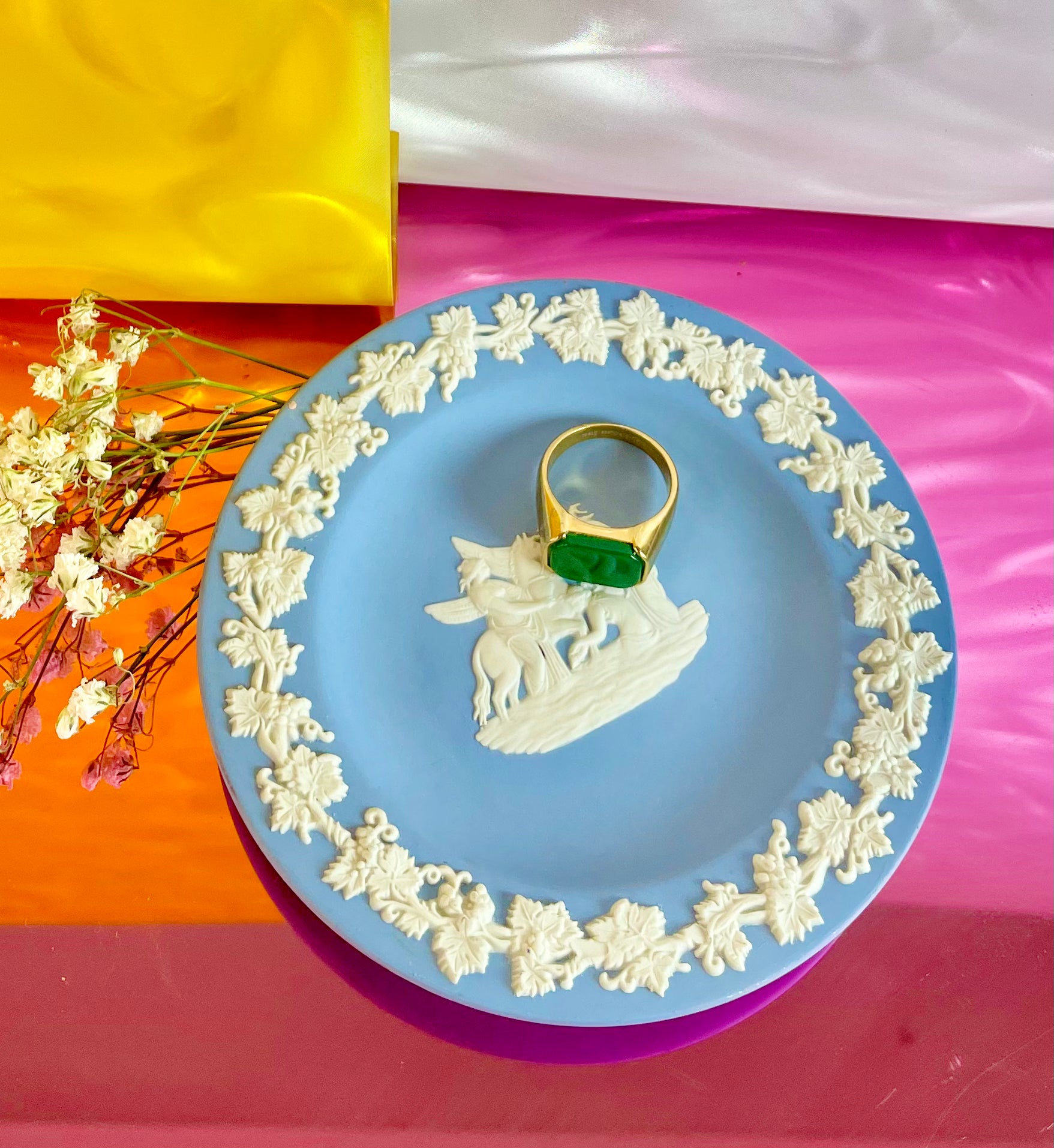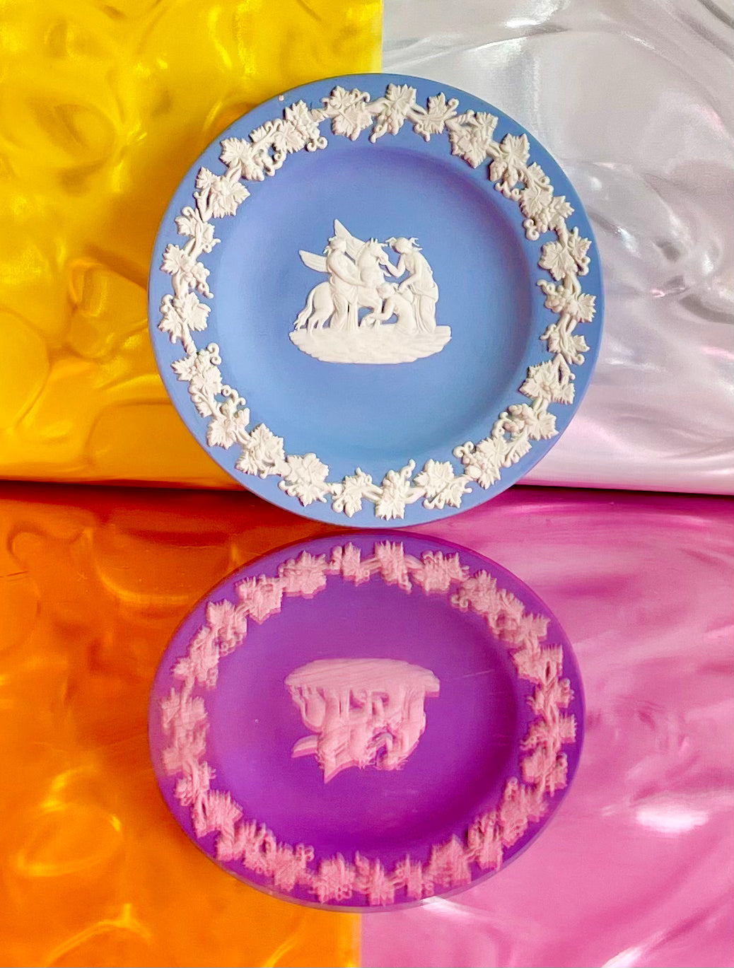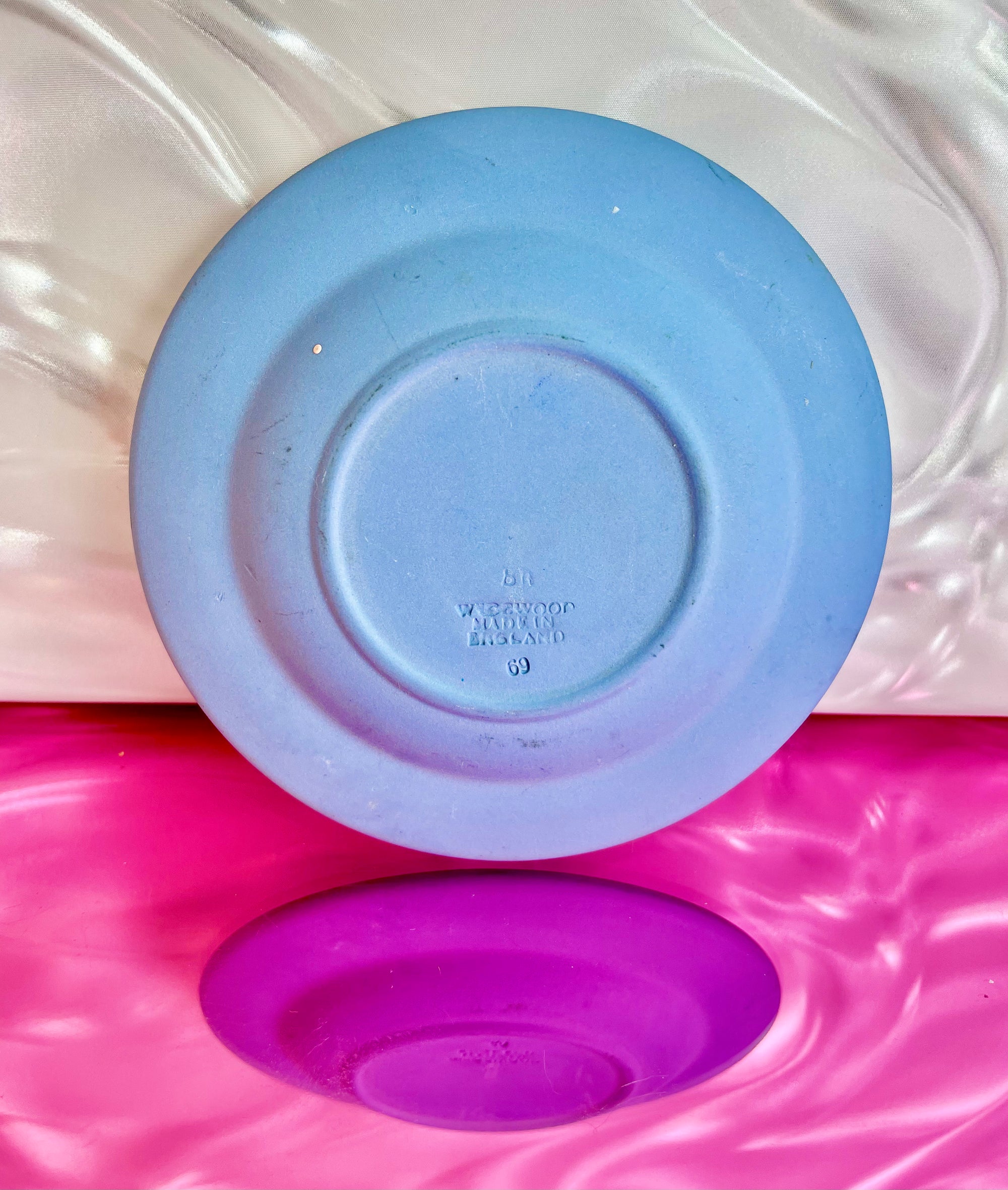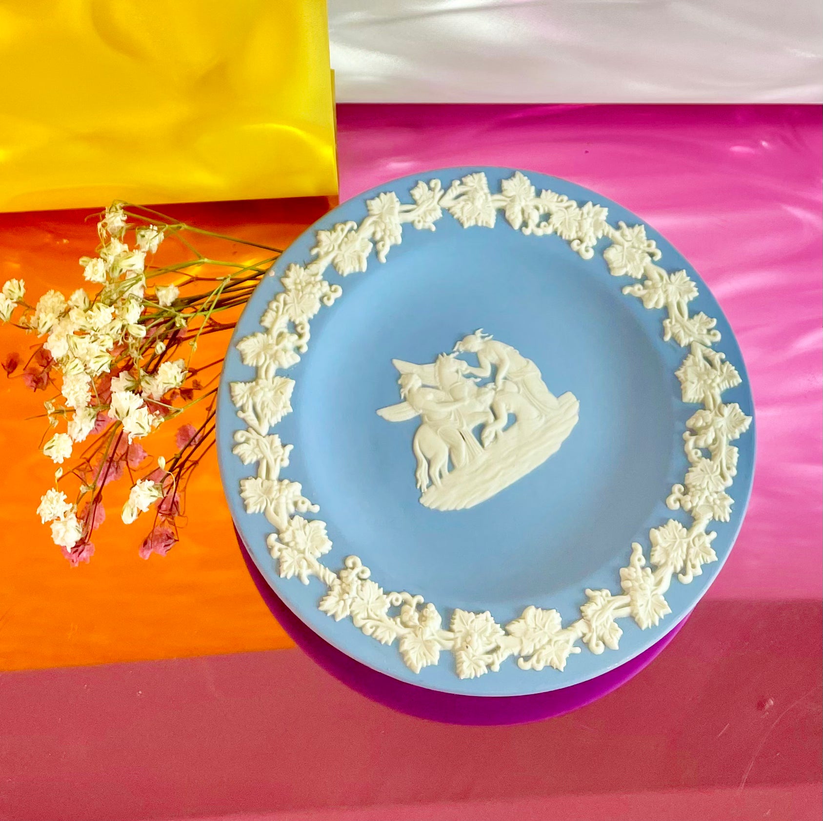 This Blue Wedgewood Jasperware Saucer depicts a mythological pegasus scene, surounded by grape vines. Made in England, with the Wedgewood maker's mark on the back.
