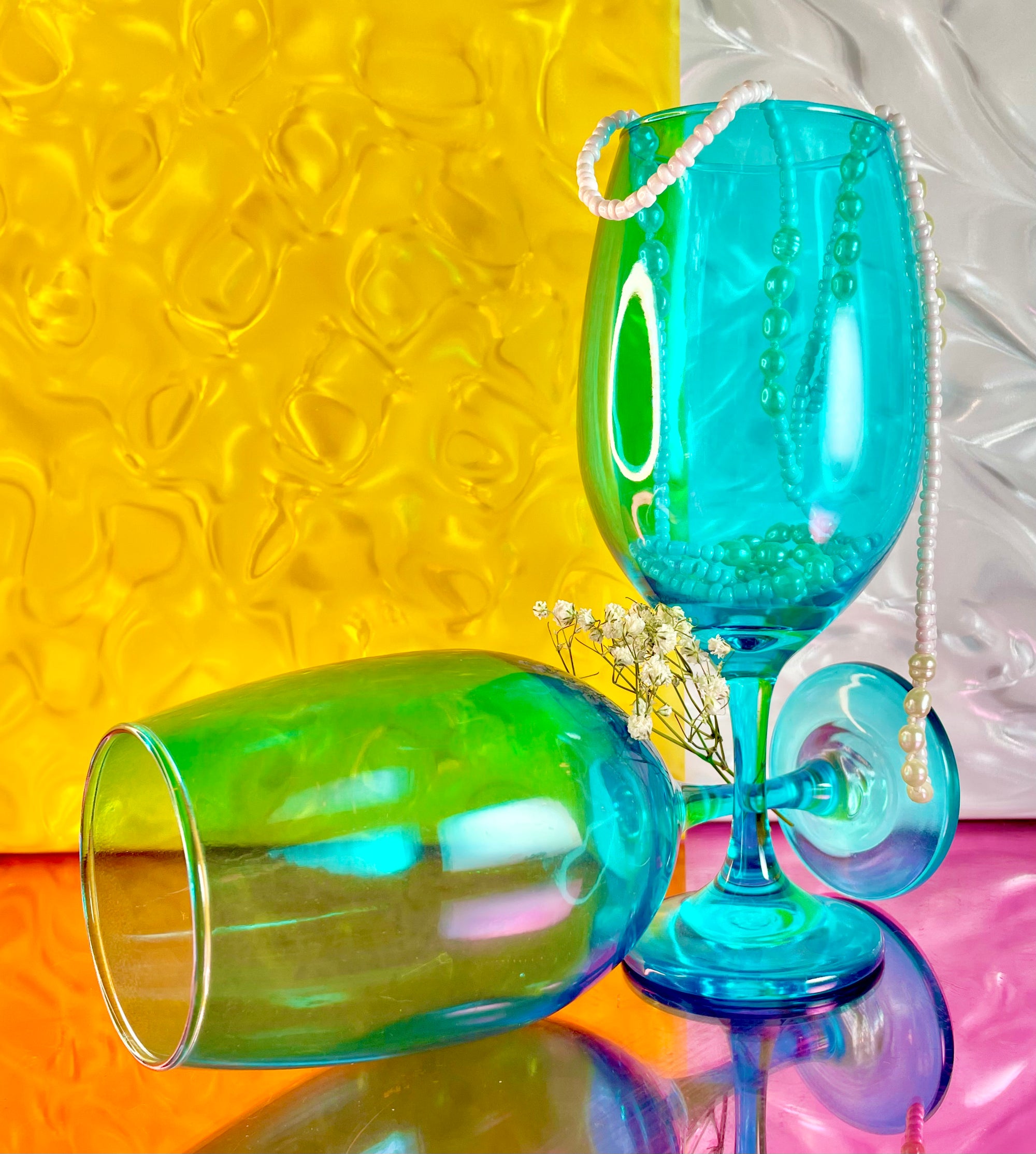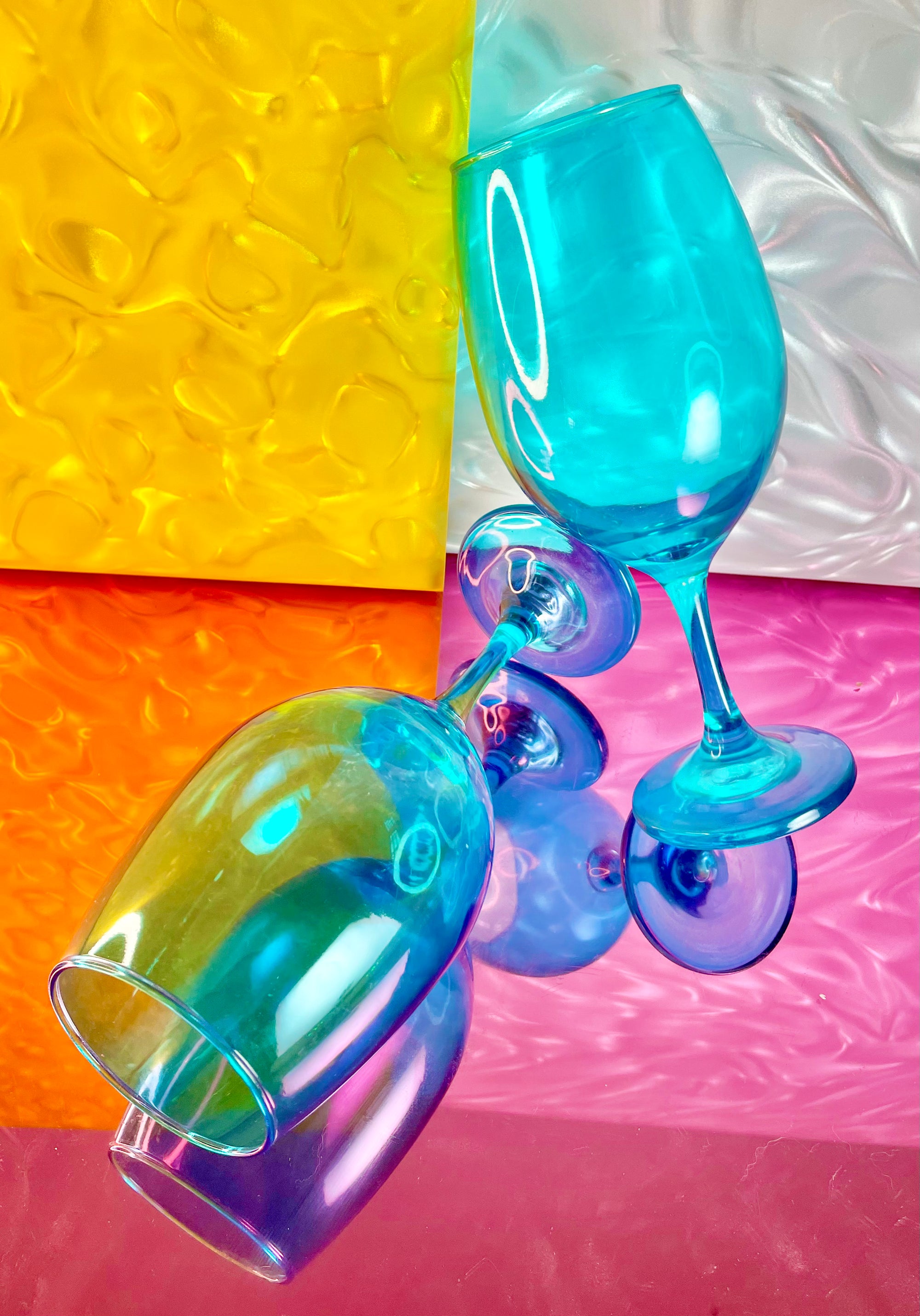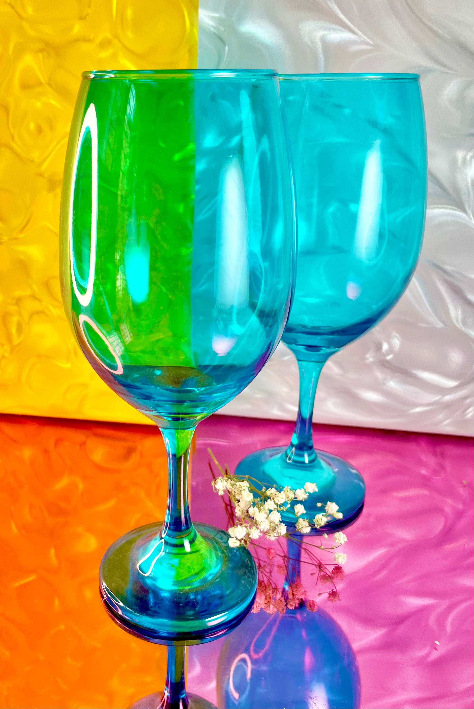This pair of Cerulean Glass Wine Glasses adds a bright pop of color and energy to the sipping experience.
