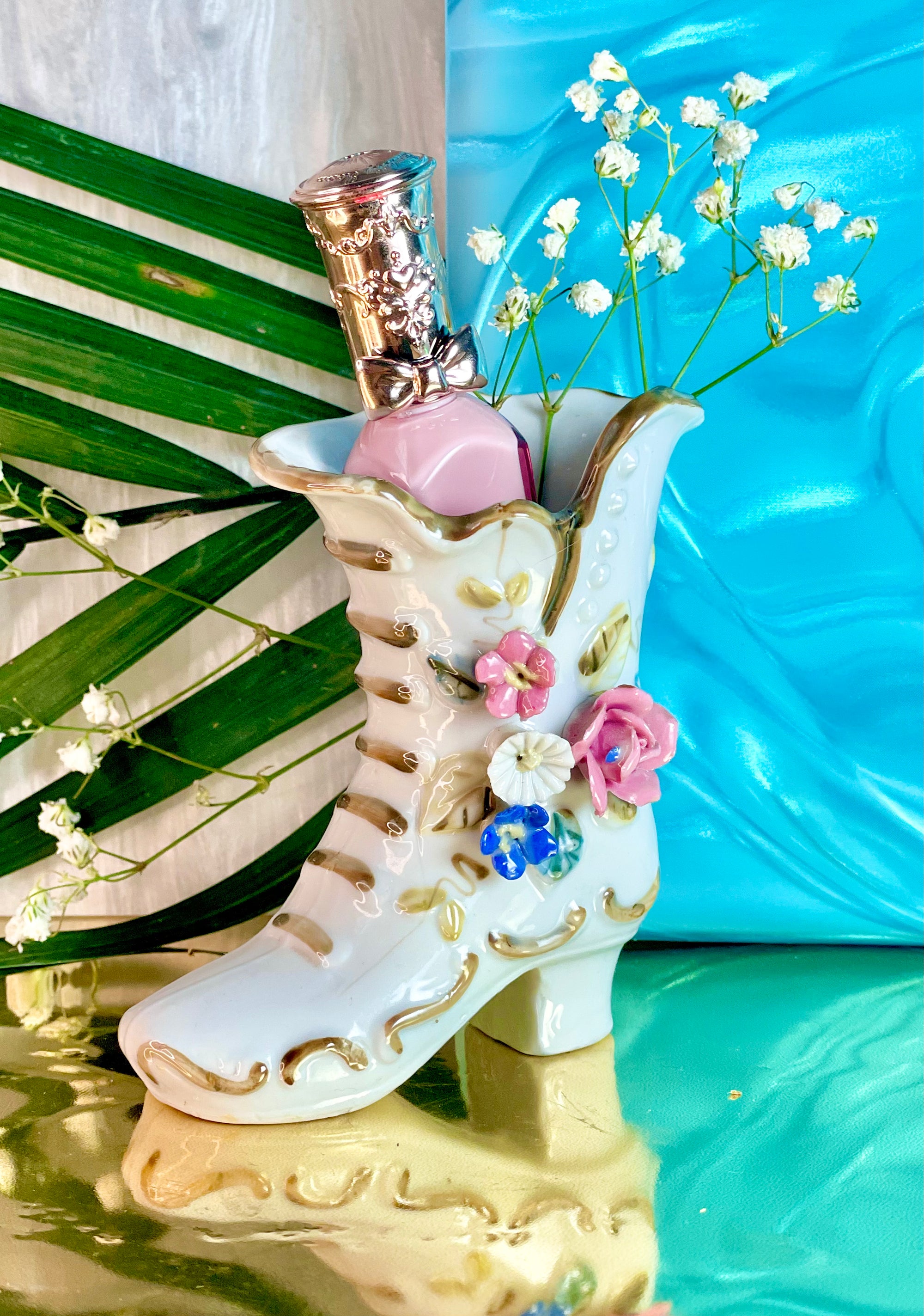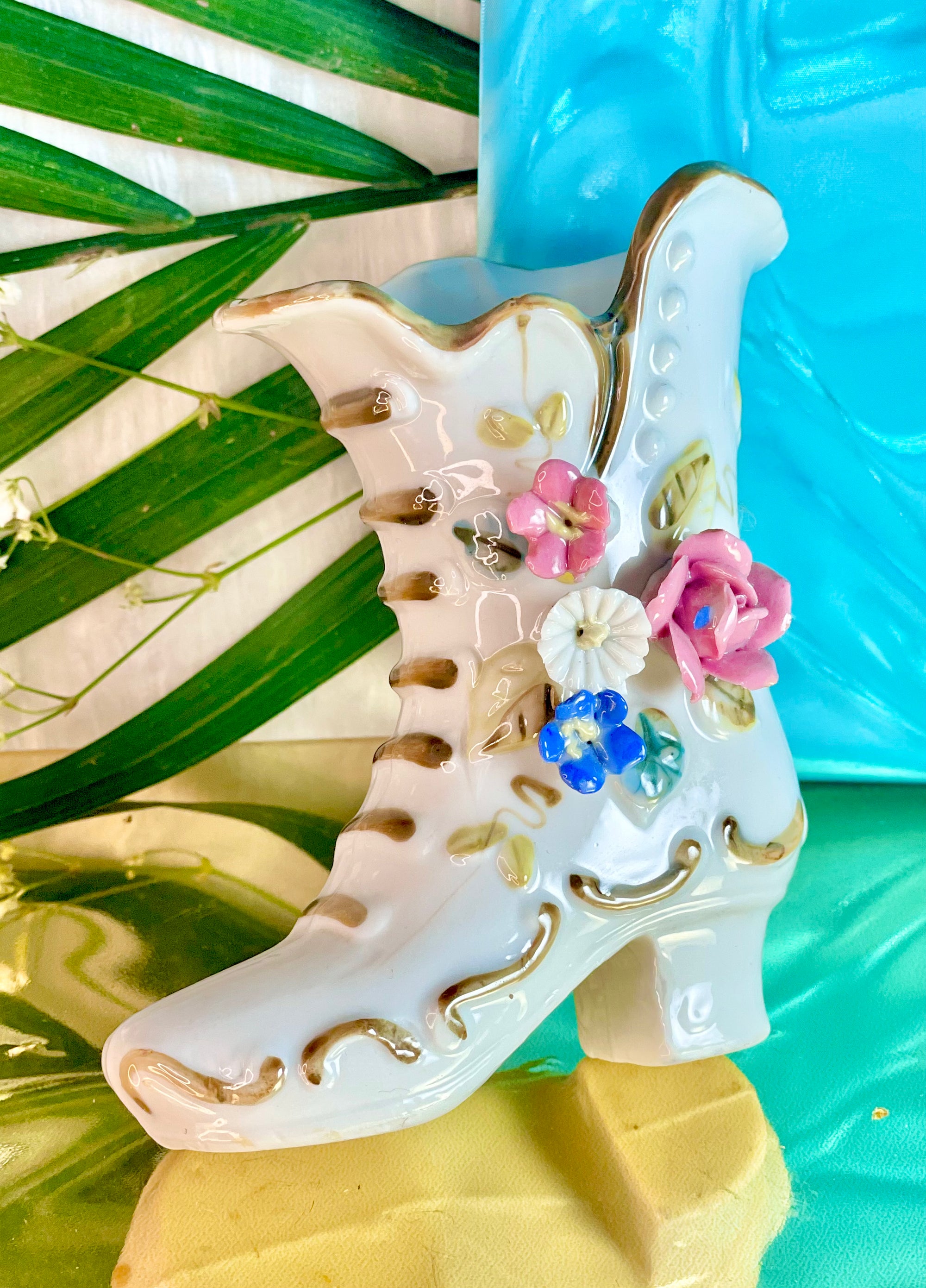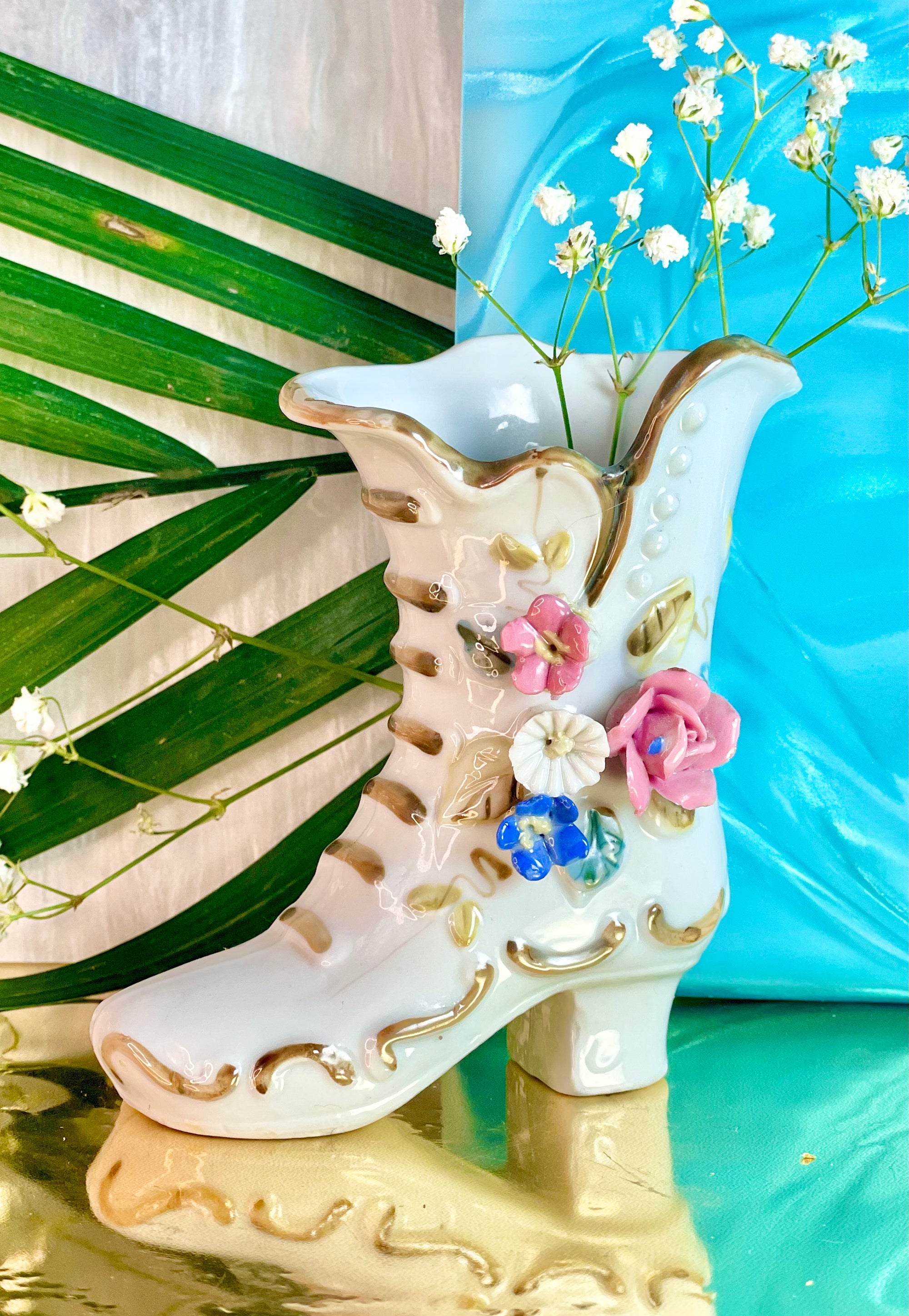 This Floral Porcelain Boot Bud Vase features gold gilding and hand-painted details. Use it as a cosmetic stasher or bus vase.